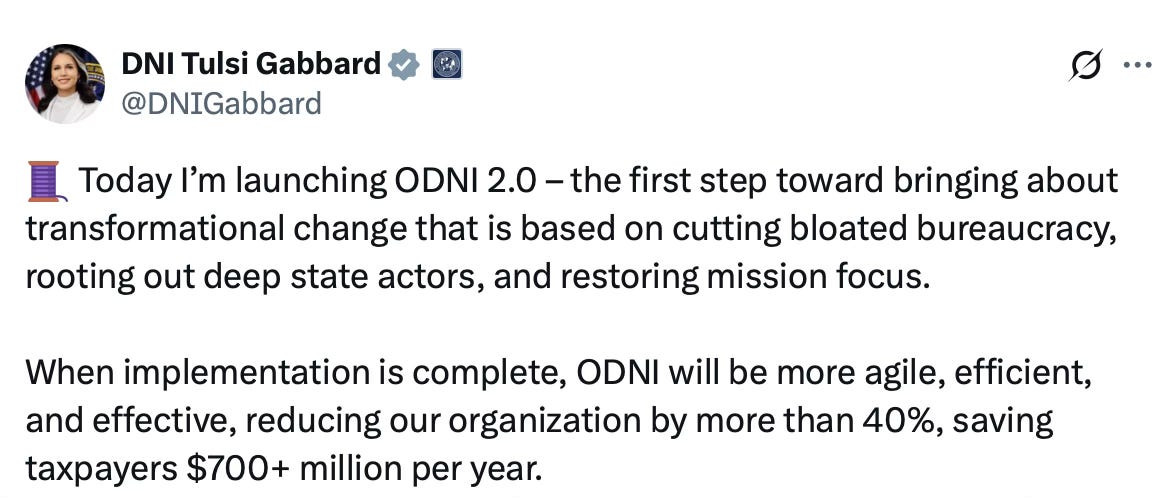 This week, she unveiled what she branded “ODNI 2.0”, a supposed reform that she says will cut “bloated bureaucracy” and “restore mission focus.” In her own words: