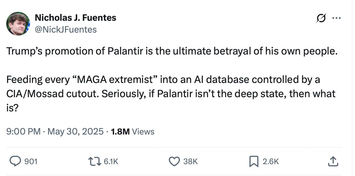 Nick Fuentes, a far-right Trump-supporting white nationalist, called the association between the Trump administration and Palantir "the ultimate betrayal of his own people” and then went on to called them the “deep state.”