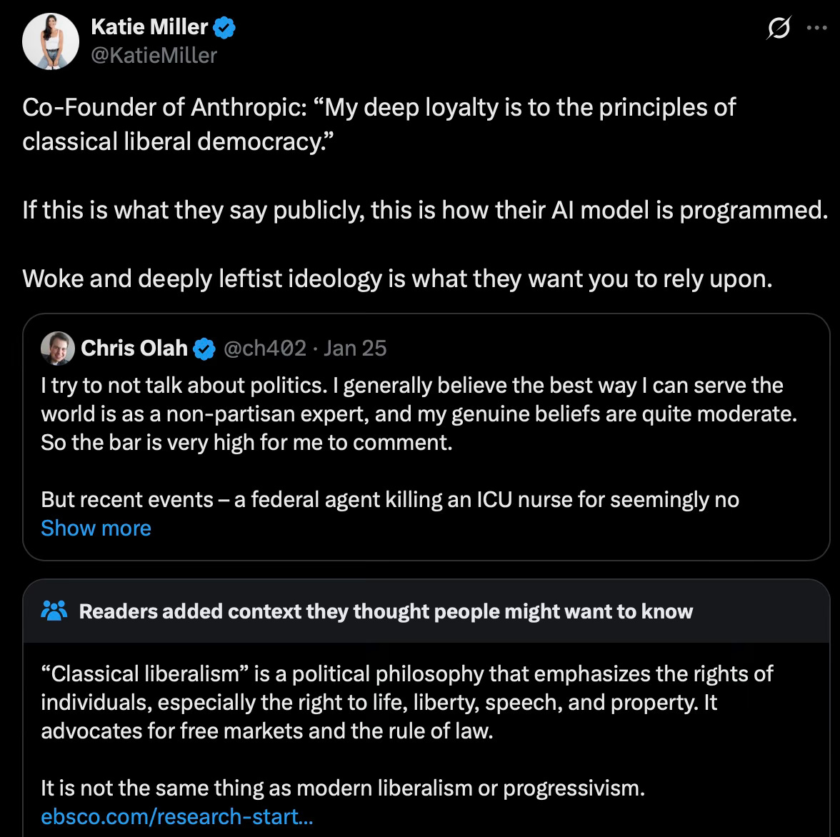 One of the most revealing moments this week didn’t come from a court filing or a press briefing. It came from social media, and it perfectly captured how distorted the worldview inside Trump’s inner circle has become. After the killing of Alex Pretti, Stephen Miller’s wife, Katie Miller, responded to a defense of classical liberal democracy by suggesting it was "woke, deeply leftist ideology." I had the unfortunate experience of working with her during Trump 1.0. The confusion on display here is, regrettably, on brand.