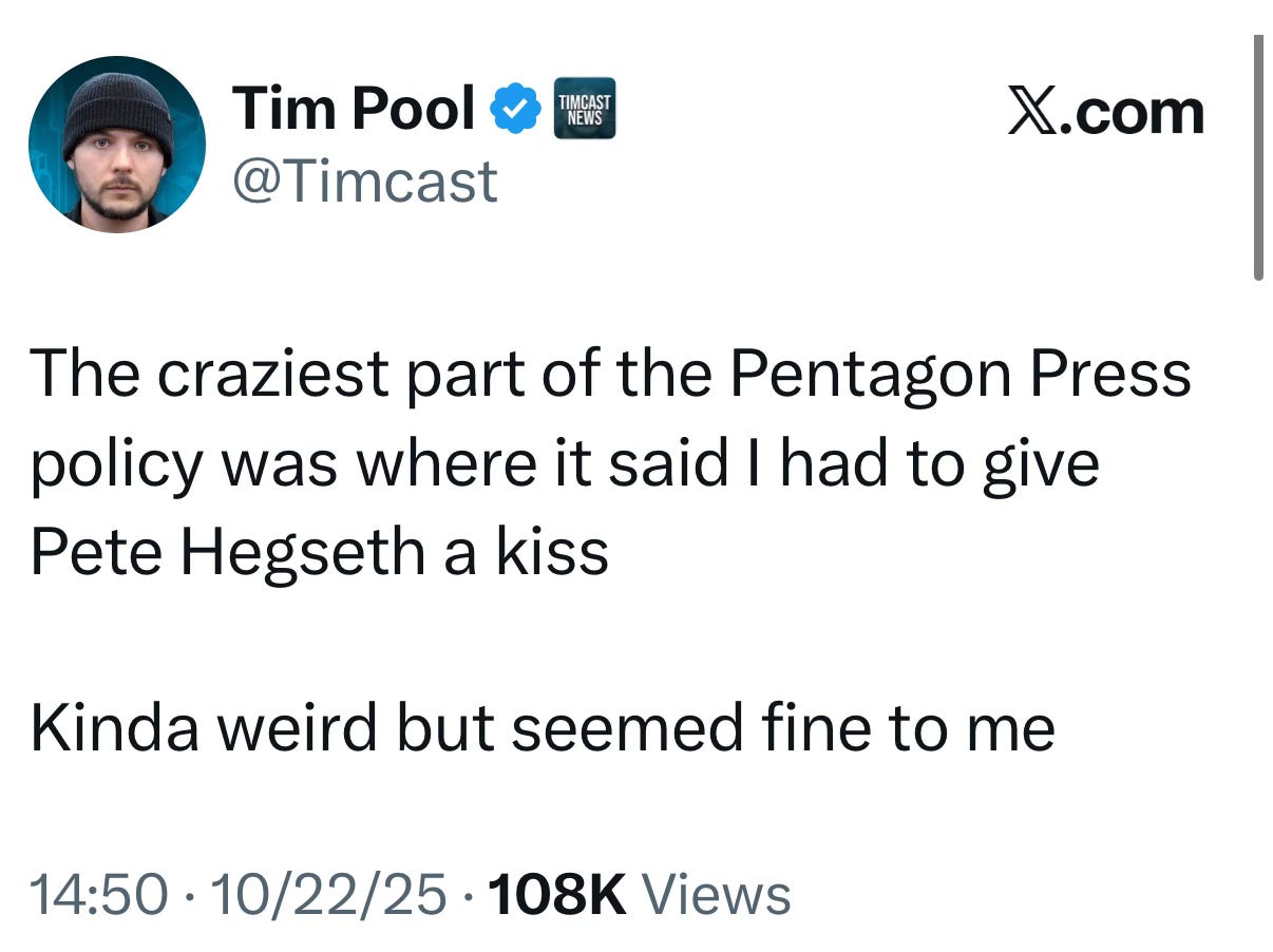 In their seats now: a lineup of far-right outlets and influencers better known for conspiracy content than accountability: Gateway Pundit, Human Events, the National Pulse, RedState, Lindell TV, Real America’s Voice, the Post Millennial, Turning Point USA’s media arm, and the Epoch Times, a publication long tied to disinformation networks. Among them is also Tim Pool, a podcaster who was implicated in a $10 million Russian influence operation meant to inflame U.S. divisions. He joked that the new Pentagon policy required him to “give Pete Hegseth a kiss.” Funny, until you remember the incompetence of Hegseth running the Department of Defense.