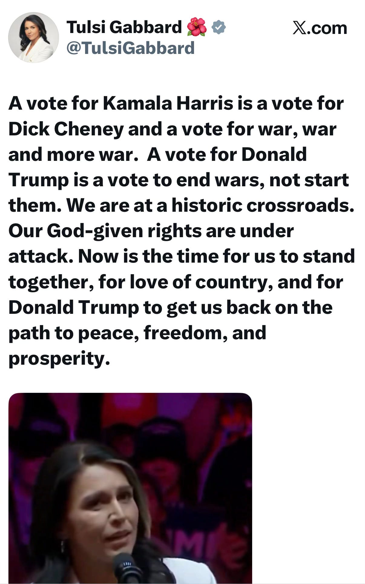 "Trump = Peace." Claims that Democrats would drag us into World War III.