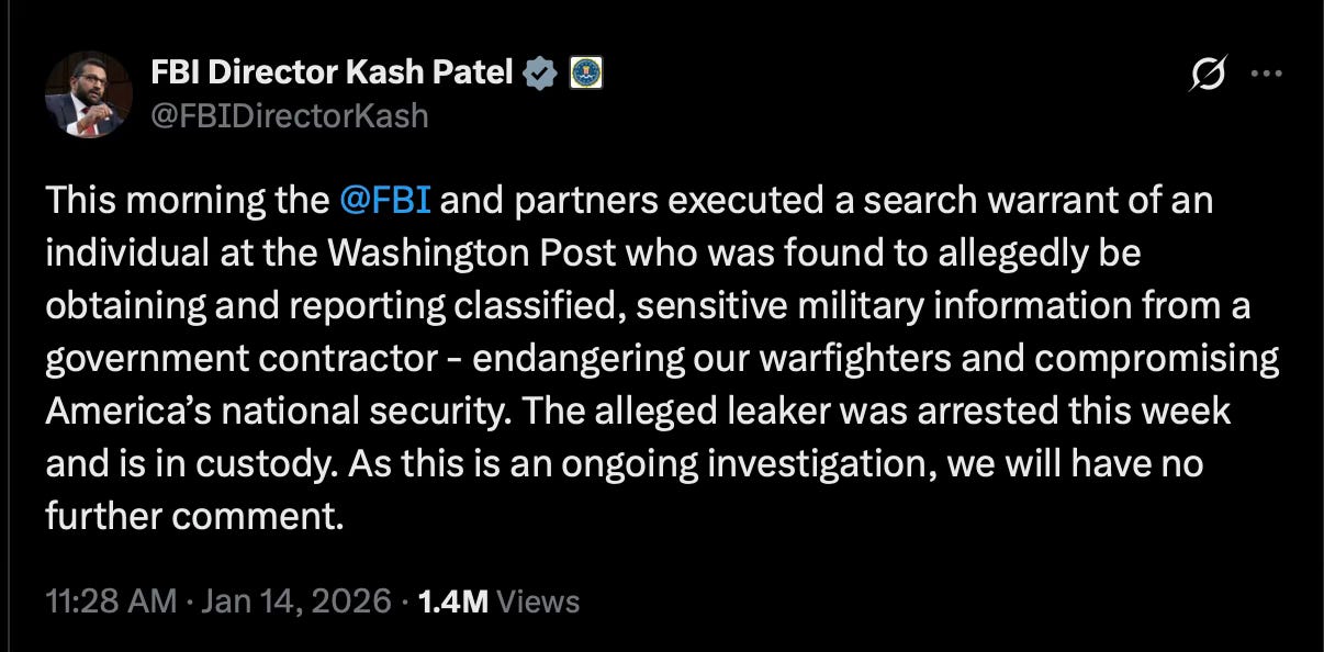 That dynamic was reinforced by a public statement from FBI Director Kash Patel, who described the search as involving “an individual at the Washington Post” allegedly “obtaining and reporting classified, sensitive military information.”